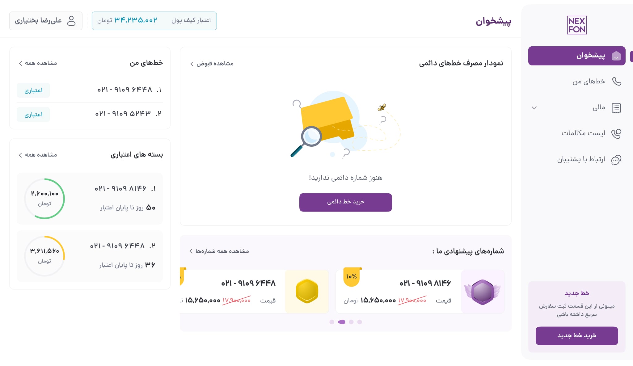 این پنل با هدف ارائه یک رابط کاربری ساده و کارآمد برای مدیریت خطوط تلفن مجازی ساخته شده است. تمرکز اصلی روی ایجاد تجربهای سریع و بیدردسر برای کاربرانی بوده که میخواهند خطوط تلفن خودشون رو انتخاب و فعال کنند و از امکانات سرویس نکسفون بهره ببرند. توی این داشبورد، کاربران میتونن خطوط خودشون رو ببینن و مدیریت کنن.